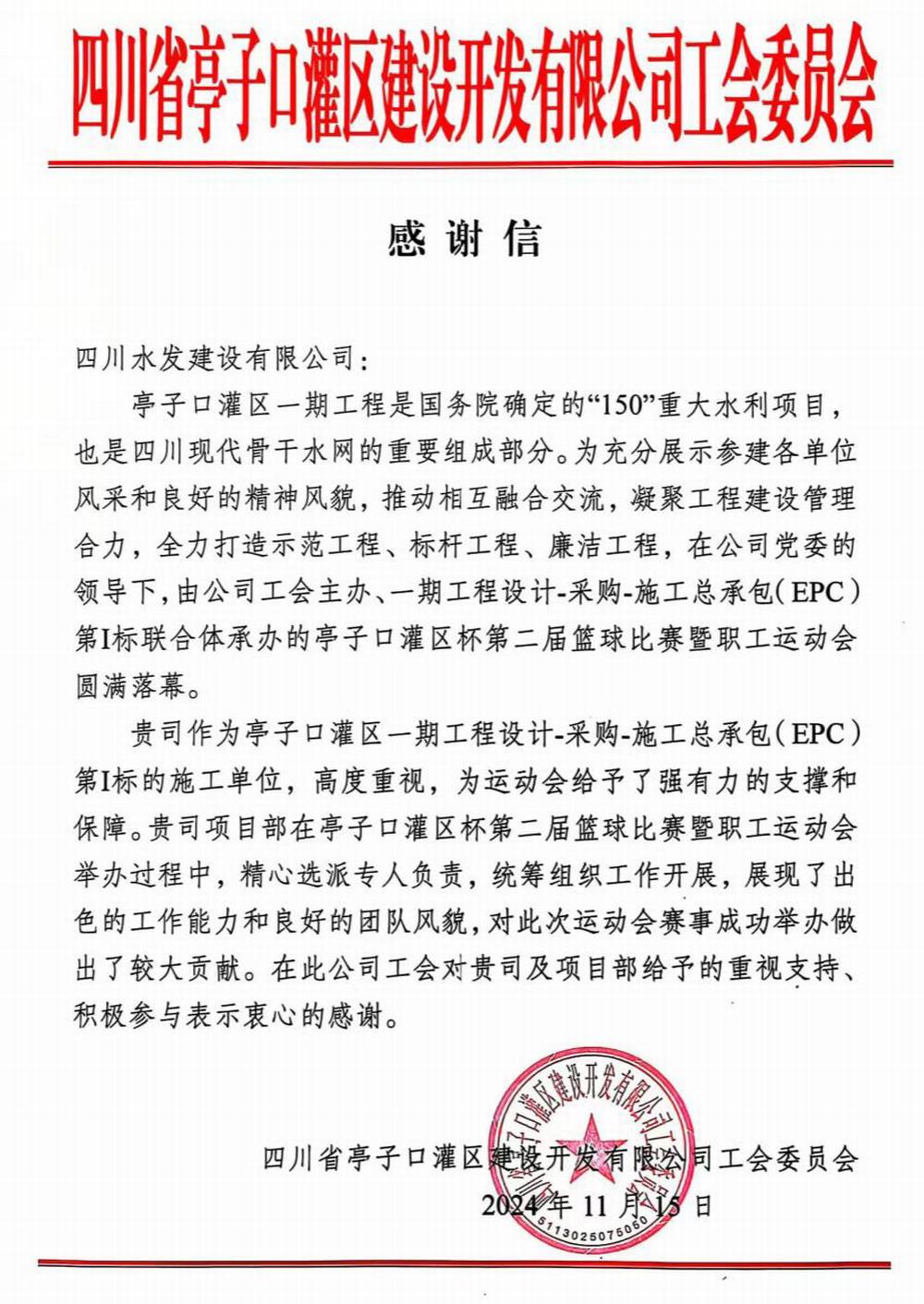 近日,公司收到來自四川省亭子口灌區建設開發有限公司發來的感謝信,對公司亭子口項目協助圓滿承辦亭子口灌區杯第二屆籃球比賽暨職工運動會活動表示誠摯感謝。
