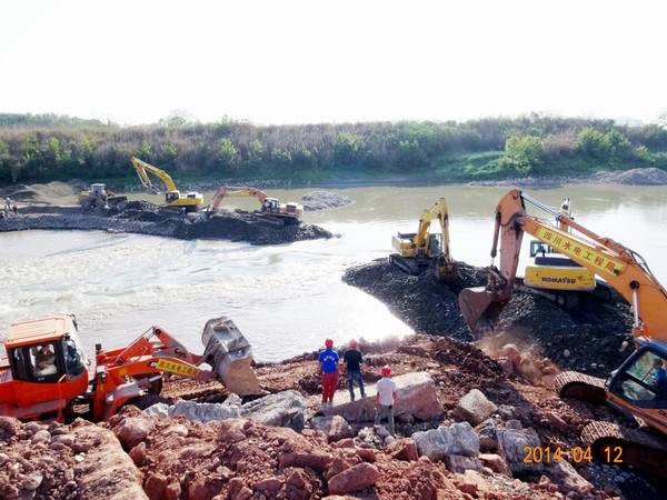 正午時分,整個工地機械轟鳴,6臺挖掘機、4臺裝載機、6輛20t自卸汽車往來穿梭,抓緊進行圍堰填筑。隨著兩岸戧堤的逐步進占,河道由寬變窄,最后形成一個寬約3米的龍口,往日平靜的涪江現(xiàn)在卻白浪翻滾,咆哮著奔出龍口。由于上游電站泄洪,導致河水水位陡增,用于截流的大塊石瞬間被沖出裹頭,最后3米的龍口始終無法合龍。面對前期準備的截流材料用盡,現(xiàn)場附近又沒有大塊石材的急情,四處領導果斷采取措施,命令截流施工人員將鋼橋板投入江中用于擋水截流,挖掘機不斷地向橋板上游投入石料。至晚上8時,二期圍堰終于順利合龍。