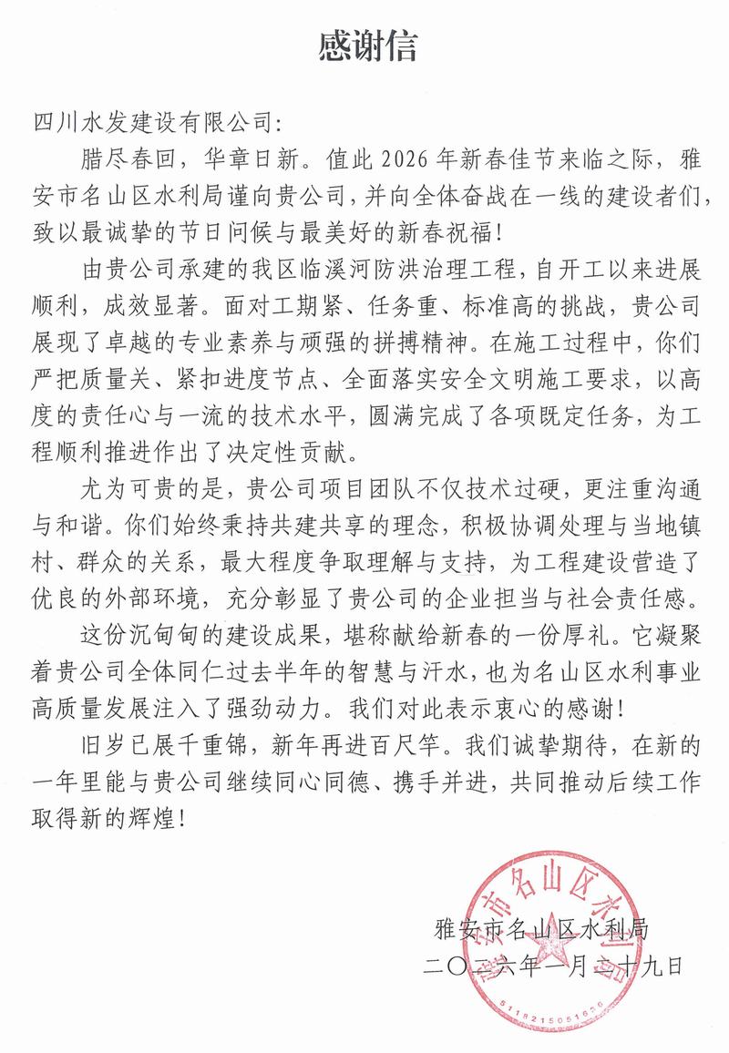 近日,公司收到來自雅安市名山區水利局的感謝信。信中對公司承建的臨溪河防洪治理工程給予高度評價,并向公司及全體一線建設者致以誠摯的新春問候與美好祝福。