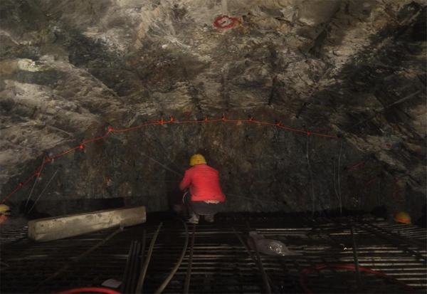 位于涼山州木里縣水洛河的鉆根公路隧洞,為單洞雙向行車隧道,隧道全長425m,隧洞開挖斷面較大,其中Ⅳ類圍巖開挖斷面9.36m×8.50m,斷面面積為64.91m2;Ⅲ類圍巖開挖斷面9.06m×7.30m,斷面面積為57.0m2。隧洞圍巖以區域淺表質地槽沉積為主,巖性主要為變質石英砂巖,節理裂隙較為發育、圍巖堅硬但完整性較差,以Ⅲ級、Ⅳ級圍巖為主。截止目前已完成隧洞開挖與初期支護施工270m,剩余155m。