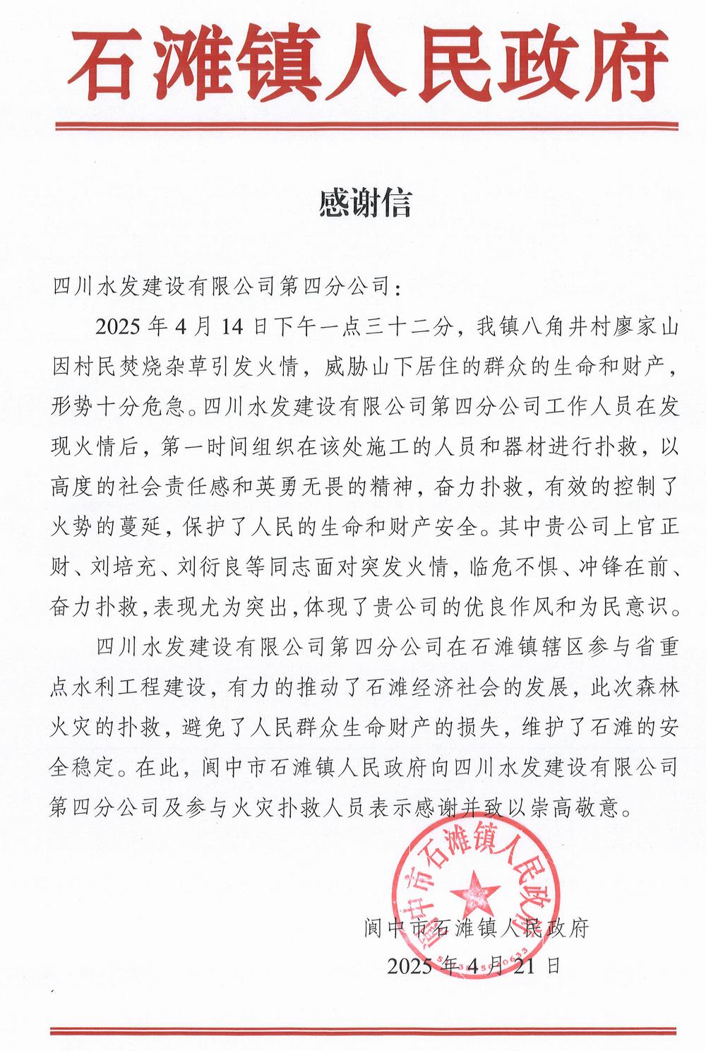 近日,四分公司收到閬中市石灘鎮人民政府感謝信,對四分公司扎根地方建設、積極履行社會責任給予高度認可,對其在危急時刻勇救山火、守護群眾生命財產安全表達誠摯感謝,并對四分公司職工展現出的社會責任感與英勇精神予以特別表彰。